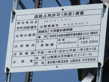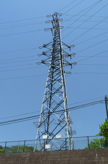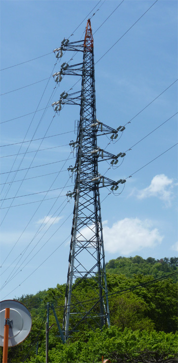 この鉄塔と初鹿野発電所とは直接結ばれており、水力で発電された電力と日川線を昇圧した66kVを笛駒線へ補充しているようです。
