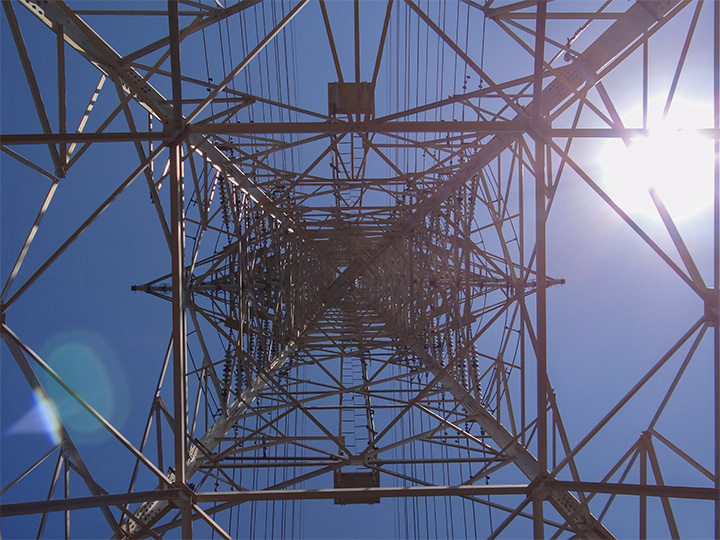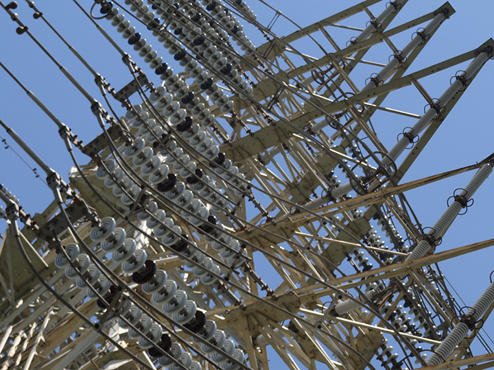 尾根越えの鉄塔の特徴として、前後の鉄塔の位置が低いため、導体が「へ」の字に折れ曲がり、ジャンパ線の位置も通常より低くなってしまうことが挙げられます。