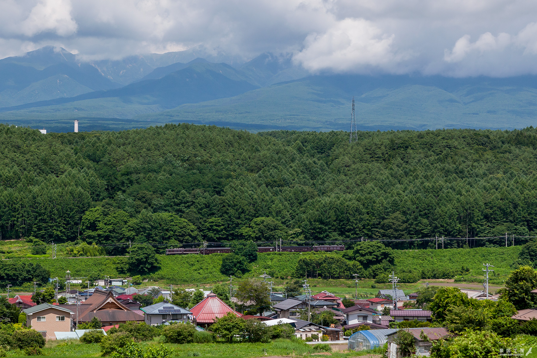 八ヶ岳、カラマツの森、中央本線、お寺のある古い集落。調和のとれた素晴らしい景色であった。