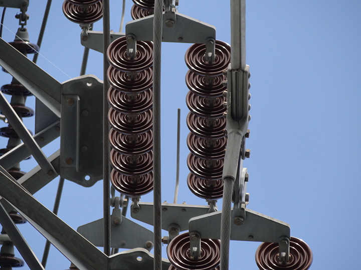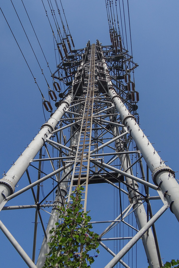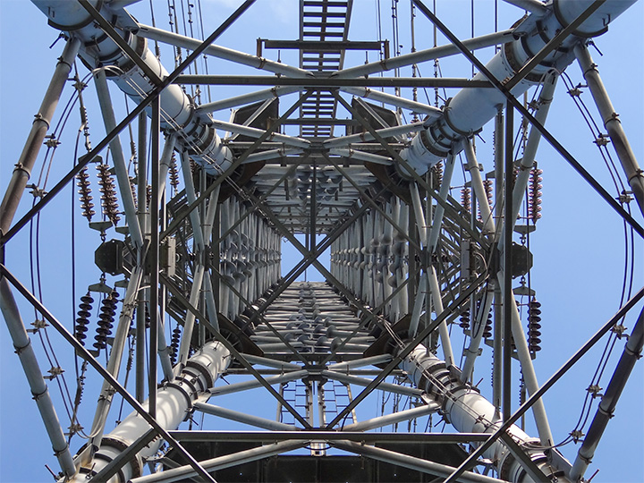 電圧の高い上層の回線はジャンパ線がV字吊りで支持され、碍子が景観色であることや、脚柱がパイプであることも特徴です。