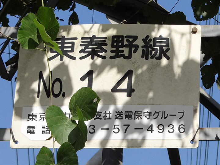 善波線は秦野変電所と湘南北線No.28鉄塔を結ぶ回線で、秦野変電所側が老番ですが、回線番号は北側が1と送り側を示しています。また、プレートには「善波連絡線」とありますが、分岐した鉄塔名は善波線となっています。