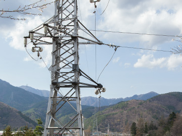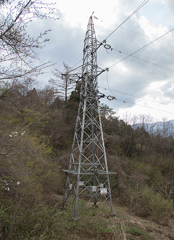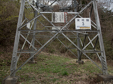 東桂線No.3鉄塔は桜の名所である通称「水槽山」の中腹にあり、ここで直角に曲がりNo.4鉄塔と結んでいます。