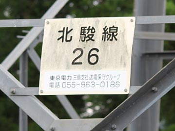 小山町側から足柄峠へ向かう県道を進むと、小足柄という付近で送電線の下を横切ります。このとき東側にある鉄塔が北駿線 No.26です。大沢方面から東尾根(通り尾根)を越え、金時山の北麓を進んでいきます。尾根越えの鉄塔のため、他のものより高さは低く設計されています。