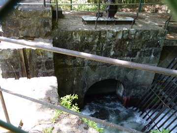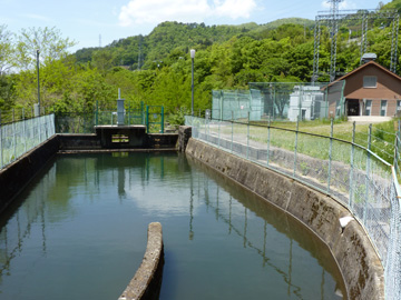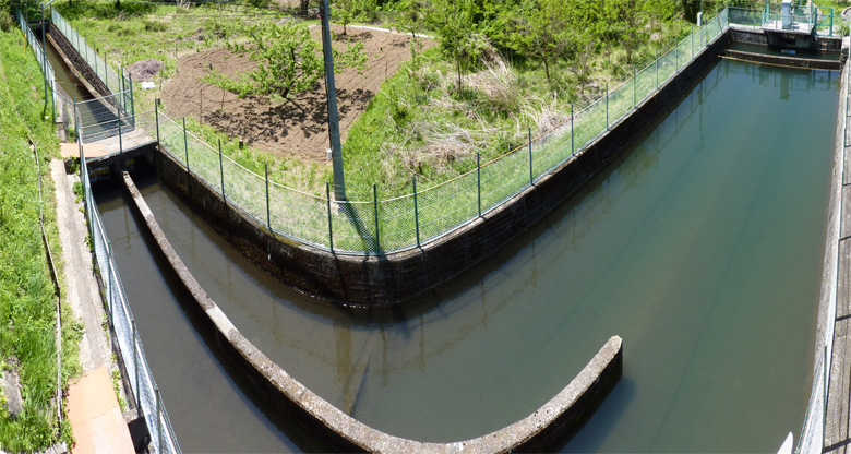 ここで土砂を沈殿させ、上澄みを発電に使用しています。沈砂池の中に橋のように水路が架けられているため、沈砂池下流側からも上澄みが落ちる仕組みになっています。