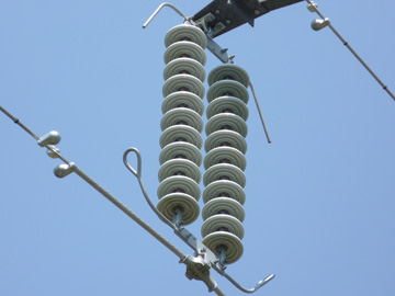 345号鉄塔は平成22年に架け替えられた、いわば新品ですが、形状は昭和2年製の他の鉄塔に準じています。左右は2連I吊懸垂、中央が2連V吊懸垂碍子です。