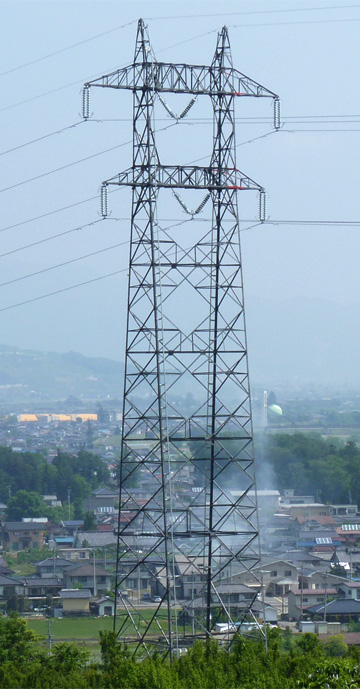 見てのとおり、2回線が左右ではなく、上下に架設された特異な形状をしています。地上からの高さを抑えることができる一方で、線下面積は広くなり、補償費が嵩むという欠点もあります。
