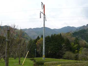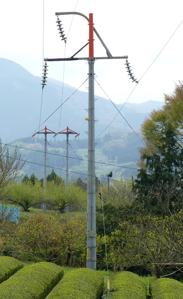 写真からも判るように、スパンの短い箇所にはコンクリート柱が使用されています。写真にある1本の型は通称「すずらん柱」と呼ばれています。見た目はかわいい電柱ですが、66,000Vの電圧がかかっています。電線に数十cmまで近づけば、直接触れなくとも感電死します。間違っても登ったりしないでください。