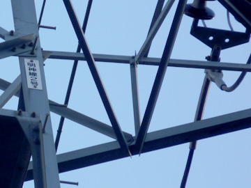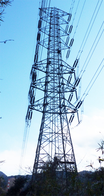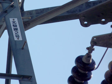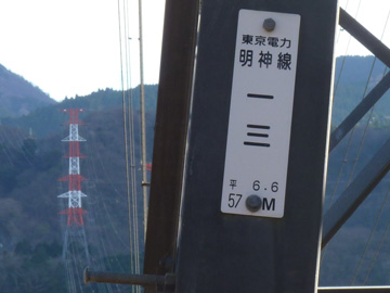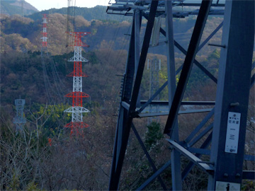 送電鉄塔明神線No.13は尾立城があったとされる尾根の上に屹立しています。 明神線はNo.15まで北駿線を併架し、この区間は平成6年頃に架け替えられたようです。この区間の標準的な鉄塔といえます。 東京電力 明神線 No.13 平成6年6月竣工 57M 航空塗色のNo.15、No.14鉄塔 鉄塔上部の左右2回線が154kVの明神線 下段の回線は154kVの北駿線 3D結界写真 交差視でごらんください。