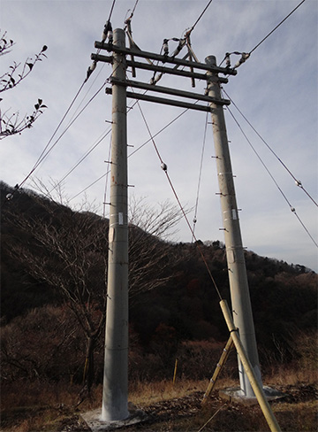 501号コンクリート柱は次の尾根までのスパンが長いため、その張力に耐えられるよう副柱を備えた鳥居型の構造が特徴です。