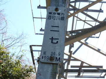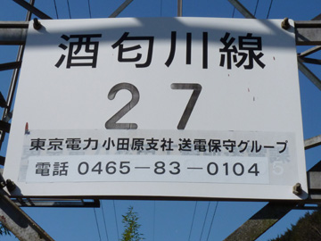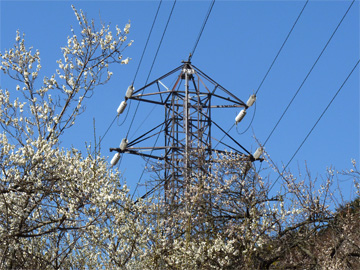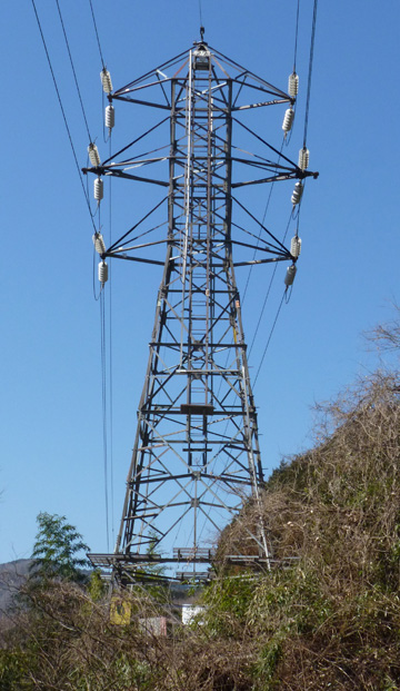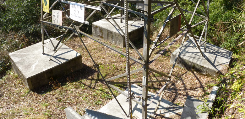酒匂川線は菅沼発電所を起点とし、新秦野変電所を結んでいます。 27号鉄塔は峰発電所背後の城山南麓にあります。最上段の腕金が架空地線の支持を兼ねている構造が特徴です。 地図>> 付近には梅林があります。 66kV耐張碍子 酒匂川線 No.27 東京電力 酒匂川線 27 昭和36年9月竣工 高さ19m 補強された基礎 急斜面に建つ27号鉄塔はコンクリートにより基礎が根巻され、補強されていました。 撮影:2011年2月下旬