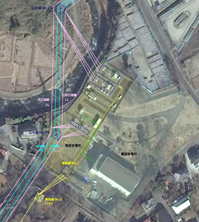 鹿留変電所には東桂線の他、河口湖線66kV2回線が接続しています。