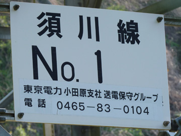 送電鉄塔須川線は須川発電所を起点とし、菅沼発電所を結んだ6kV、2回線の送電線です。須川線を冠した鉄塔は6基で、菅沼発電所構内では酒匂川線No.1鉄塔に併架され、変電設備に接続しています。