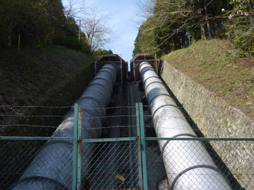 途中には七曲りとよばれるつづら折りの坂が、鉄管を横断しています。