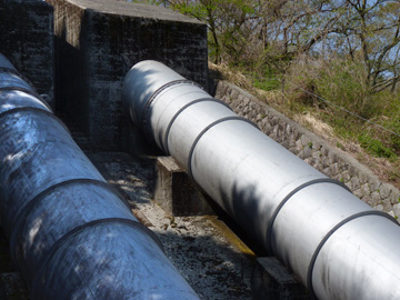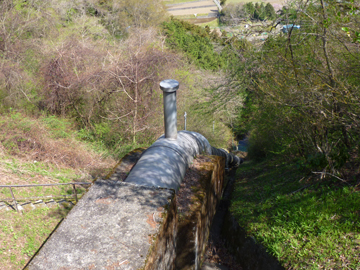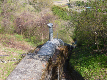 上部水槽から須川側へ余水路が鉄管で施工されていました。 上に突き出たパイプは水の重さによる引き込み現象対策の空気弁と思われます。