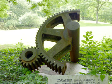 この歯車は、三保ダムの建設によって、埋没した東京電力嵐発電所、田ノ入ダムのローリングゲートの巻上機に使われていたものです。