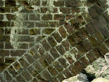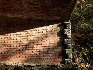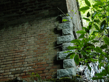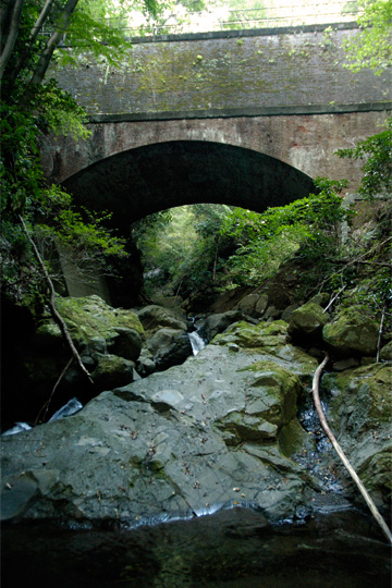 階段を下りると間もなく水路橋が現れます。想像していたものより、ずっと威厳と風格があり圧倒されました。山北発電所の運用開始が大正3年ですから、それに合わせて建設されたもので、百年近くの歴史を抱くことになります。現代の通り一遍な土木構造物にはない美しさが感じられます。導水路は発電所でなるべく落差を確保するため、1/1000〜1/1500という水平に近い勾配で施工されています(1/1000勾配とは1km進んで1mの高低差)。水力発電施設は、地形と密接な関係があるため、地図好きには興味はつきません。