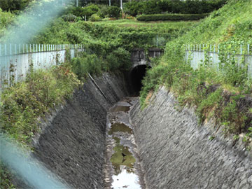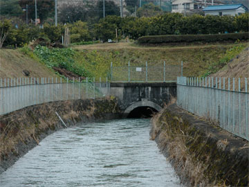 役野の水門から取水され、最初に地上に現れる場所です。落差を稼ぐため酒匂川右岸をほぼ水平に流れていき、内山発電所で使用されます。止水時には下の写真のような断面が見られます。