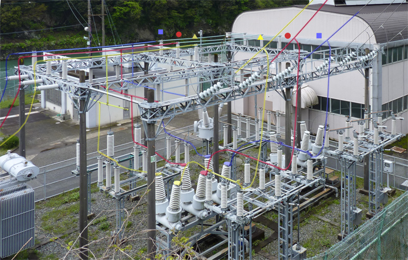 同行して下さったSさんの解説によると、これら三相交流のうち上相を示す記号が赤で●、中相が白の▲、下相が黒また青の■とのことです。