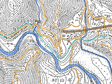 明治中期測量の迅速測図によると、後にこの隧道の出来る尾根は、南へ半島のように突き出した様子が伺え、水路のために盛土したのではなく、天然の地形だったことが判ります。発電所の選定にあたっては地形を巧みに利用した設計であることが伺えます。