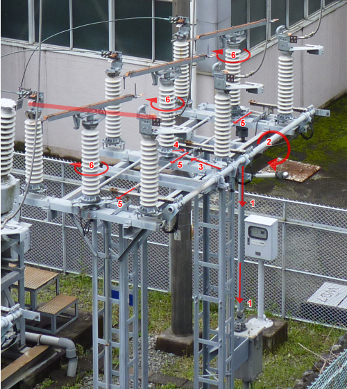番号1の下にあるボックスが遠隔操作により起動し、最終的に番号6の器械が時計回りに回転すると通電する仕組みです。