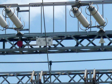 山中湖の西部に変電所を見つけたので立ち寄ってみました。ここが山中線の終点で、最老番の78号鉄塔が変電所手前に建っていました。山中線は周囲の環境に配慮した景観色が施されているのが特徴で、碍子の数から判断するに66kVの回線です。