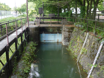 山中湖畔にある設備。これはゴミ取りのフィルターで、水門は東電が管理しているようです。