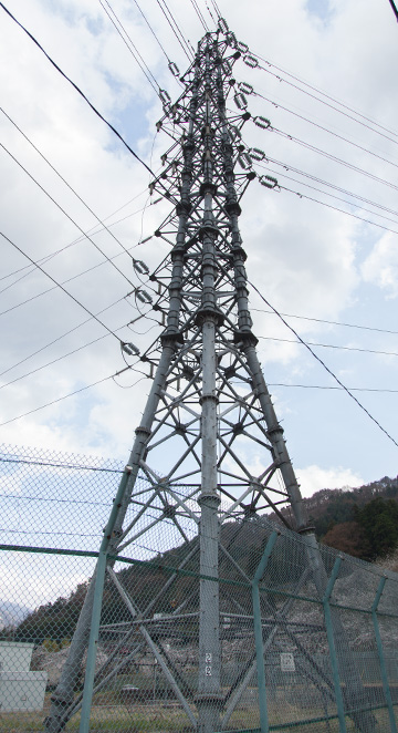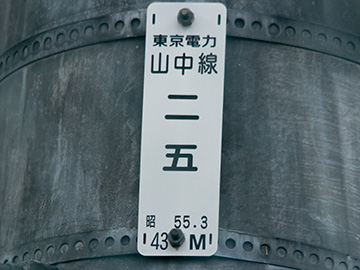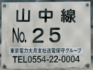 山中線は谷村発電所を起点とし山中湖変電所までを結ぶ66kV2回線の送電線です。 山中線No.25鉄塔は上段2回線が山中線、下段2回線に河口湖線を併架し、かつ河口湖線は鹿留変電所に接続しています。 東京電力 山中線 No.25 昭和55年3月竣工 高さ43m
