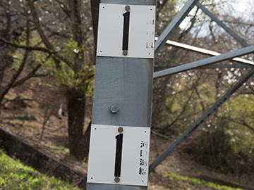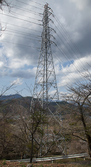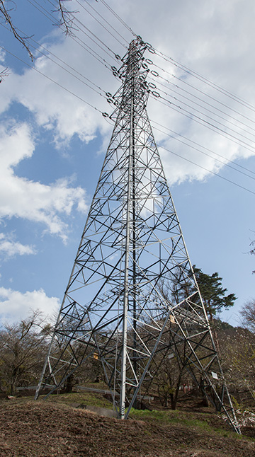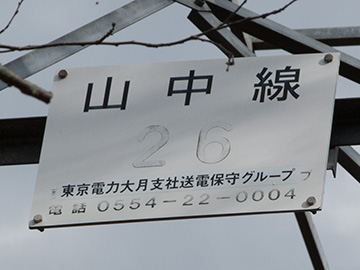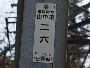 山中線 No.26 山中線は谷村発電所を起点とし山中湖変電所までを結ぶ66kV2回線の送電線です。 山中線No.26鉄塔は上段2回線が山中線、下段2回線に河口湖線を併架しています。 Yahoo!地図(別窓)>> 東京電力 山中線 No.26 昭和57年4月竣工 高さ57m 上段の回線名札 山中線 下段の回線名札 河口湖線 回線札に併記された回線名